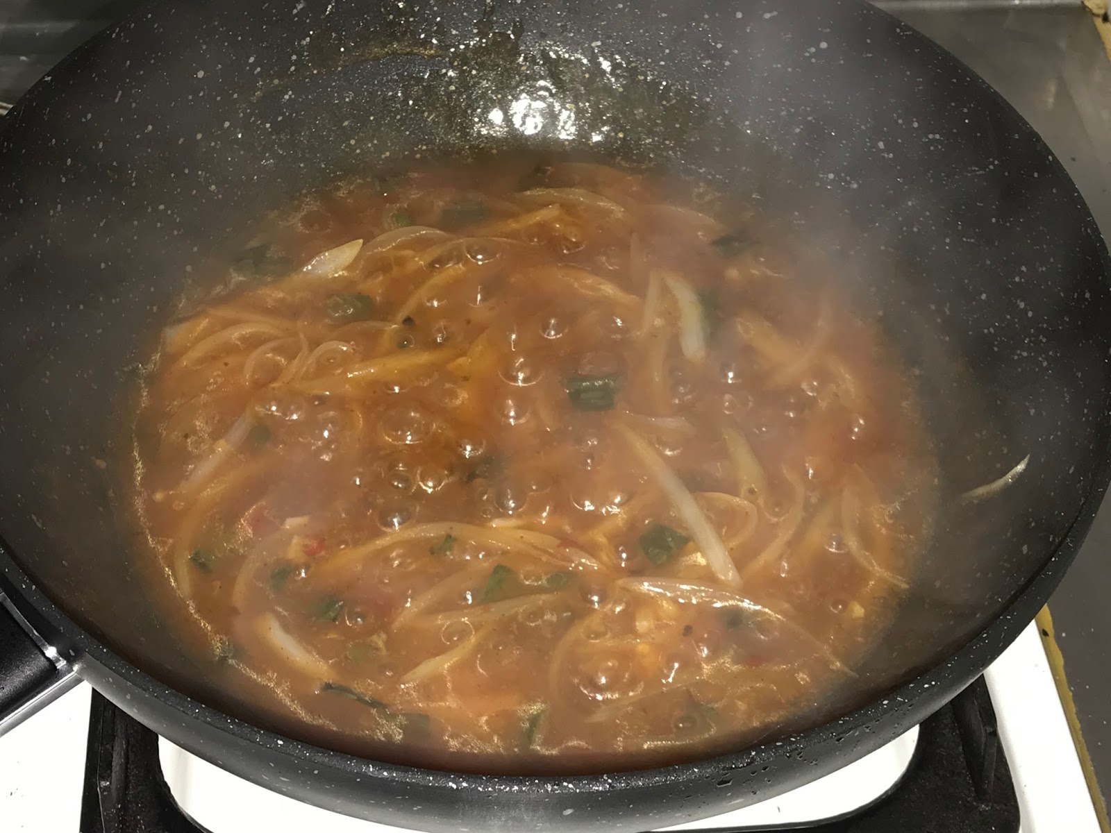 5. Now add tomato sauce,chilli sauce,soy sauce, pepper powder and salt. Fry for a minute. Now take 2 teaspoon of corn flour and dissolve it in 1 cup of water. Add it to the pan and mix well.